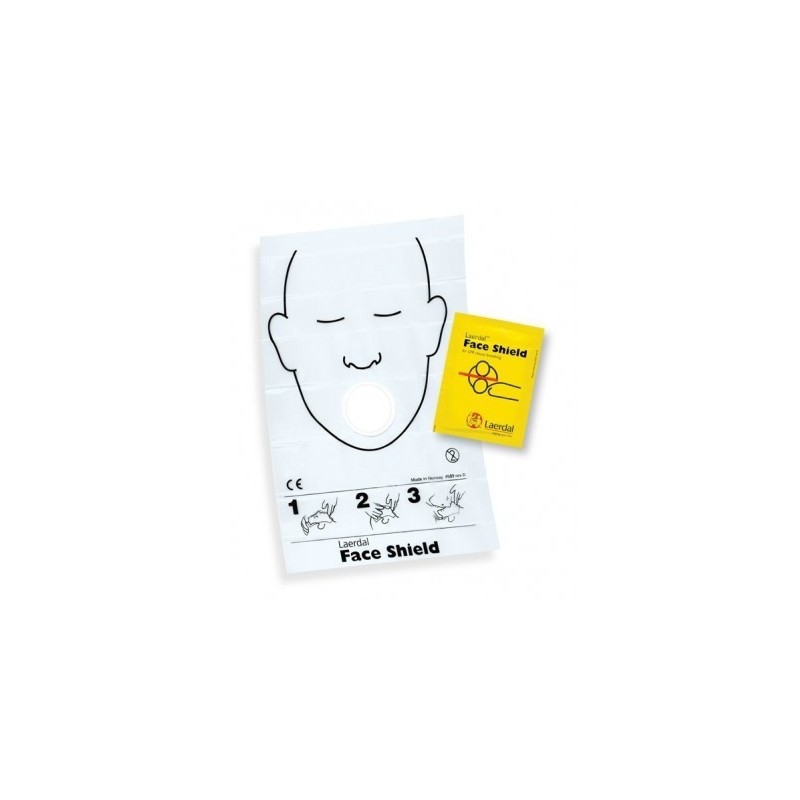 Remarque : Le Laerdal Face Shield est utilisé dans les urgences réelles. La feuille de protection Laerdal pour formation, un modèle différent, offre une sécurité aux étudiants qui veulent éviter tout contact avec le visage du mannequin pendant la formation à la RCP, voir FOR105.
