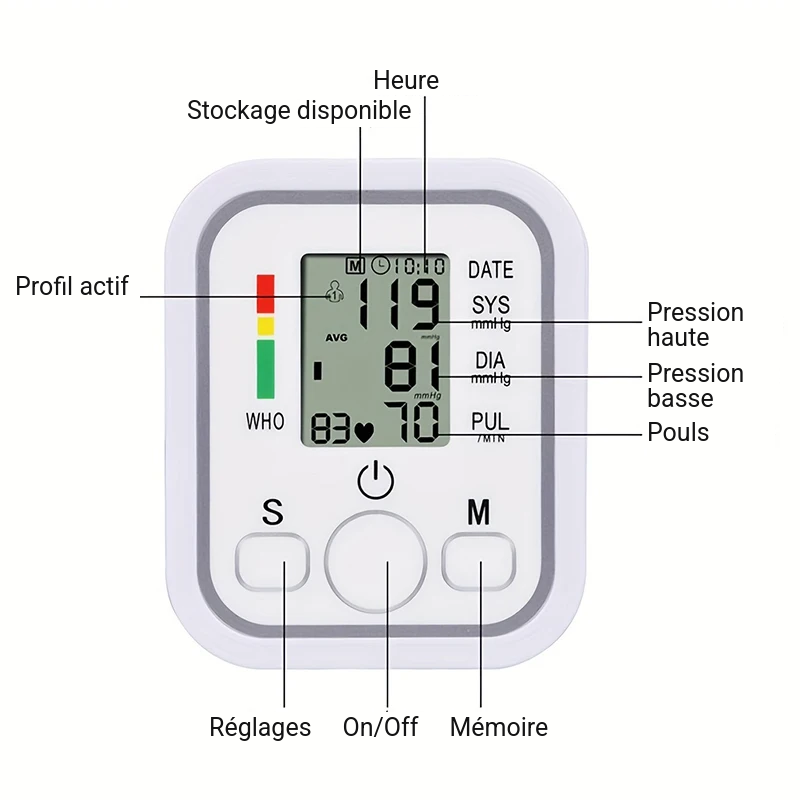 Stocke jusqu'à 99 mesures pour 2 profils utilisateurs différents et affiche une moyenne sur les 3 dernières mesures.