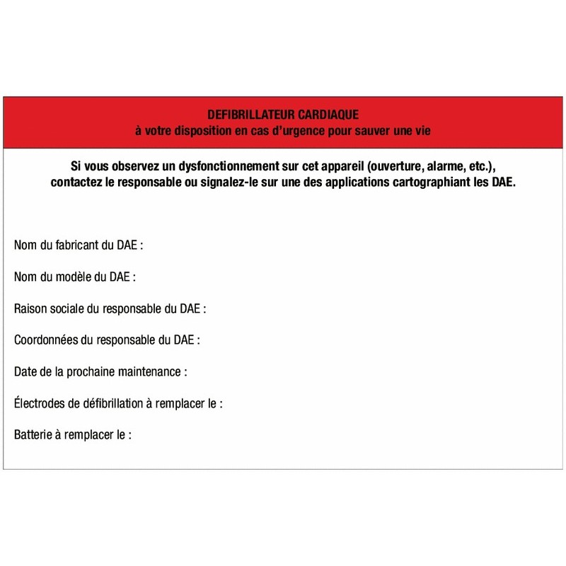 - Doit être apposé à proximité immédiate de l'emplacement du DAE ou sur son boîtier.