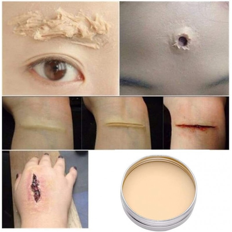 La cire maquillage se travaille directement sur la peau comme une pâte à modeler. Une fois le volume mis en place, on peut le maquiller à l'aide des fards crème.