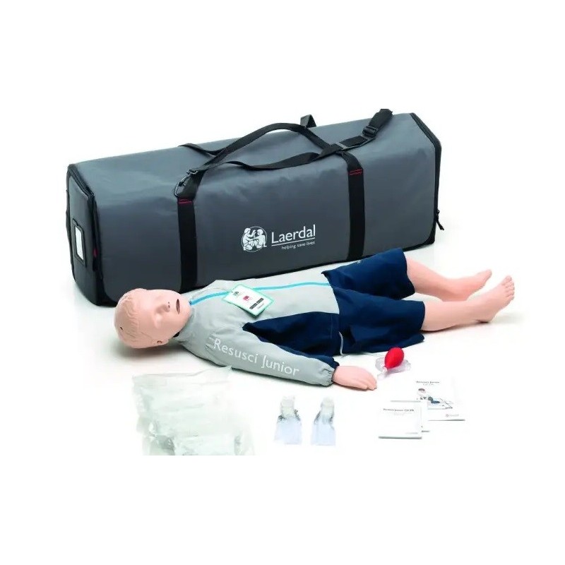 Le Resusci Junior est un mannequin simulant un enfant pour la formation aux techniques de réanimation et de sauvetage. Fermeture et ouverture des voies respiratoires réalistes par bascule de la tête et subluxation de la mâchoire.