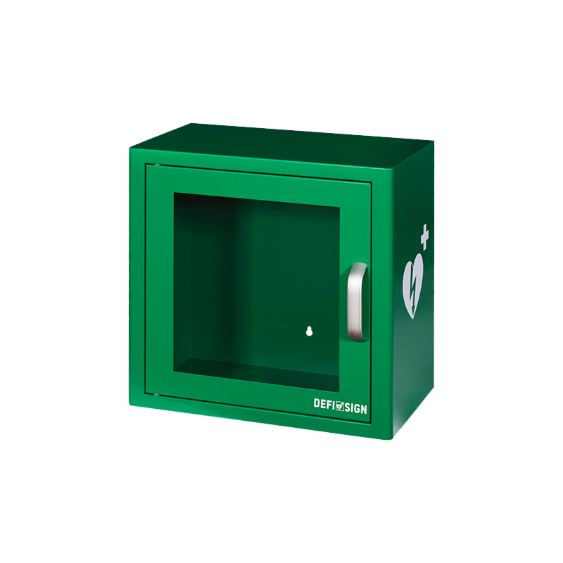 Solide et facile à installer, cette armoire métallique est très facilement reconnaissable grâce à sa couleur verte et son logo défibrillateur.