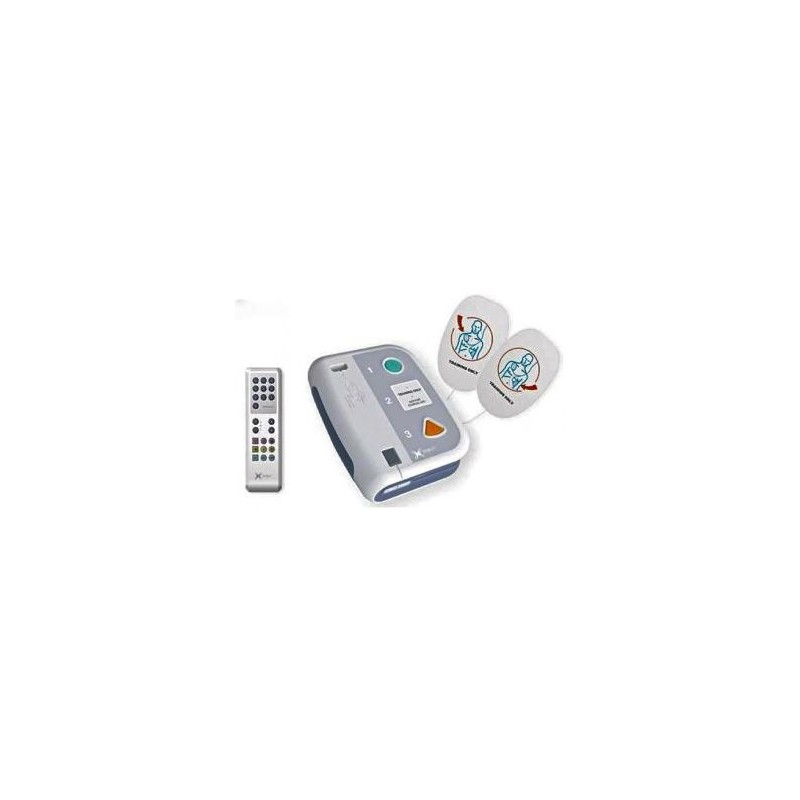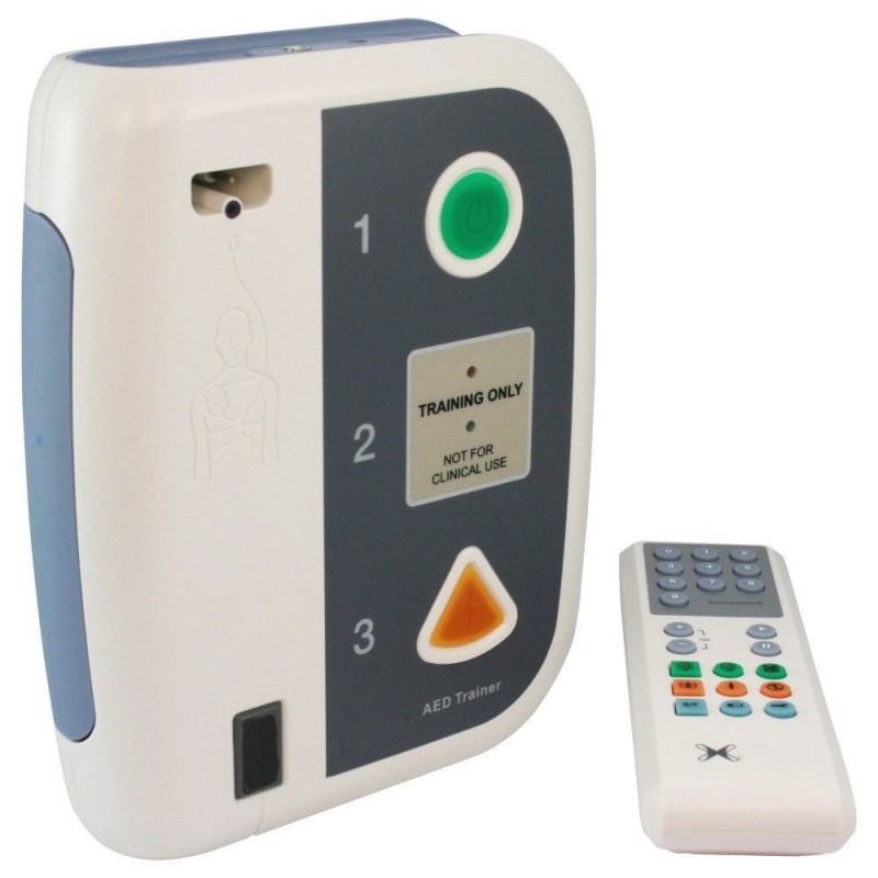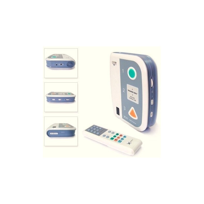 Un défibrillateur de formation simulant fidèlement un DAE automatique ou semi-automatique, avec guidage vocal, voyants lumineux et métronome intégré.