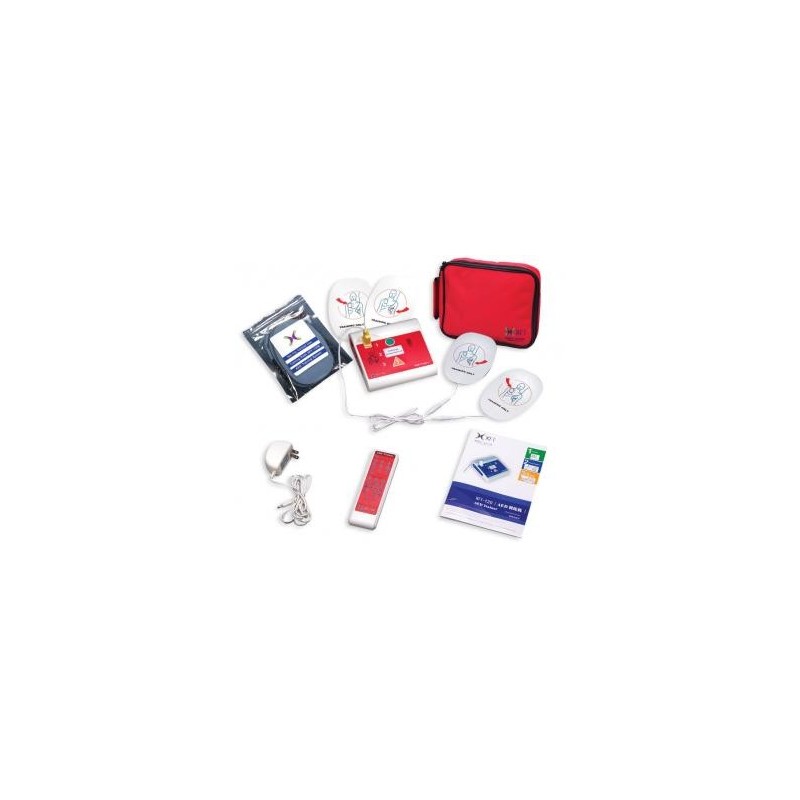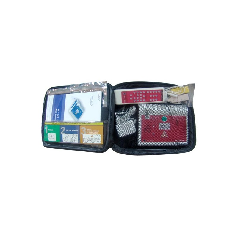 Livré avec sac de transport, télécommande, électrodes adultes et pédiatriques, chargeur et mode d’emploi.