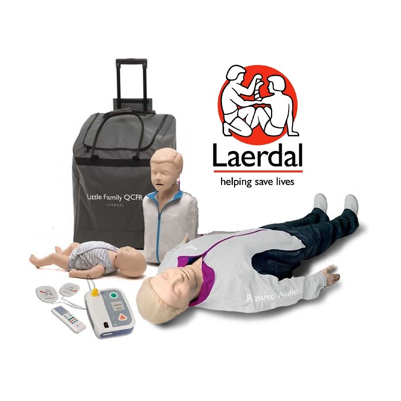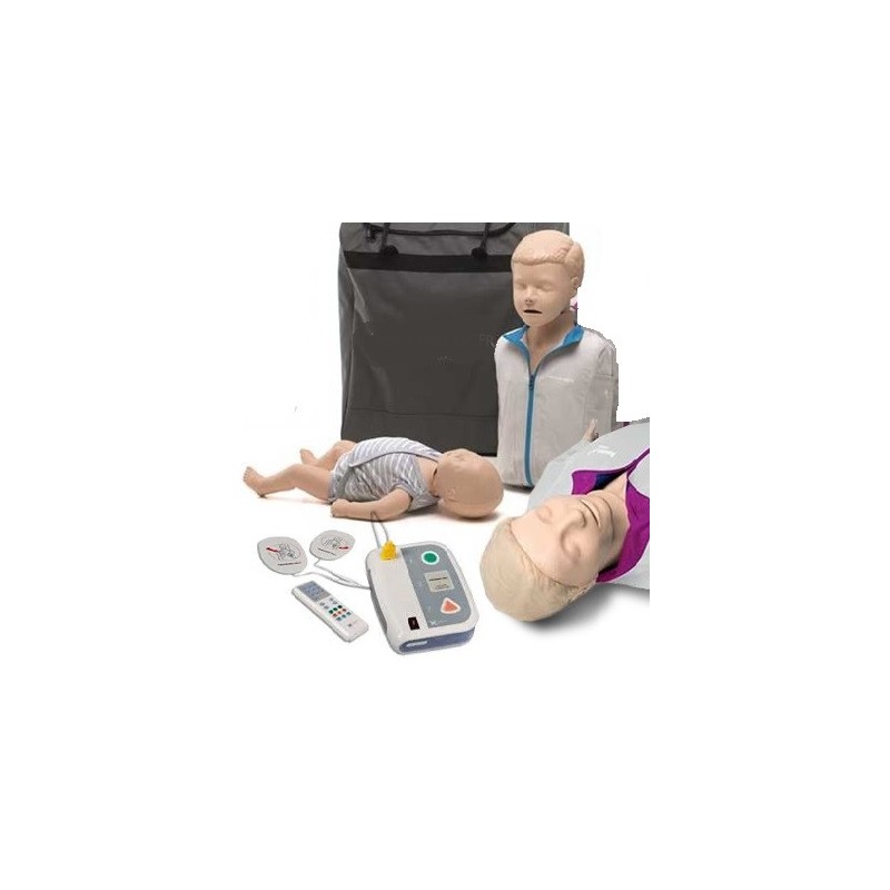 Il comprend le nouveau mannequin Resusci Anne QCPR corps entier en valise semi-rigide trolley, un mannequin enfant tronc Little Junior QCPR, un mannequin bébé Little baby QCPR et un défibrillateur DEA/DSA , équipé d'un métronome intégré, de toute nouvelle génération.