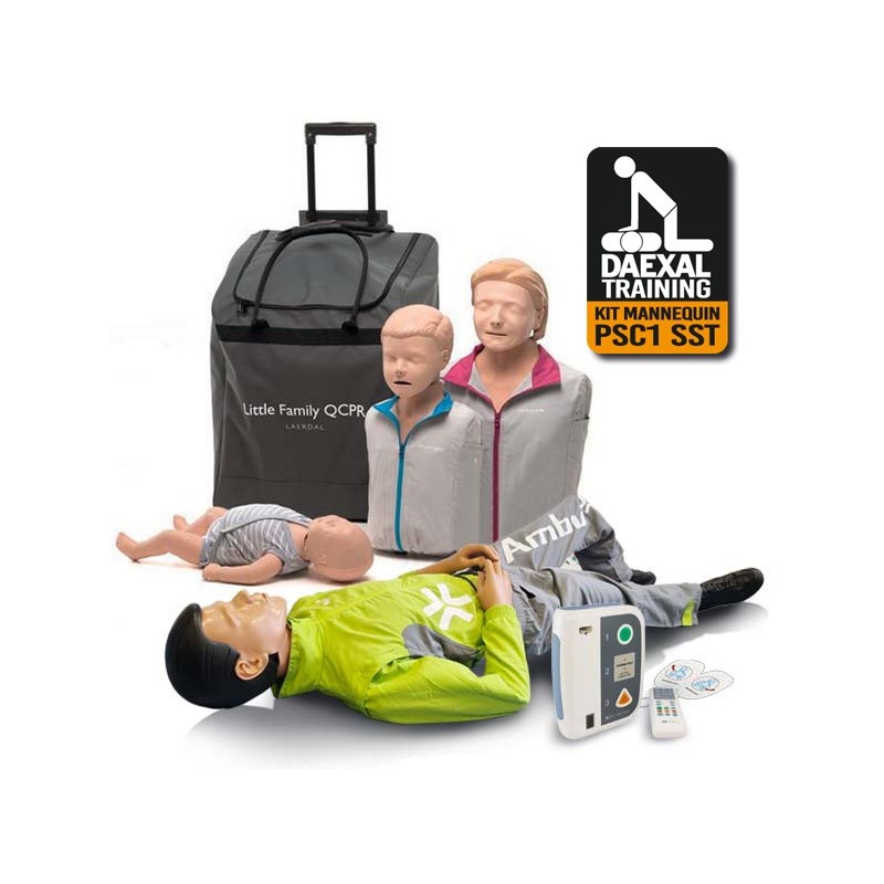 1 mannequin Little Junior QCPR avec 2 voies respiratoires, 1 masque de visage, 1 veste de survêtement, 2 piles, 6 lingettes de désinfection et un mode d'emploi (Contrôle de compression thoracique par clics sonores ou BlueTooth)
