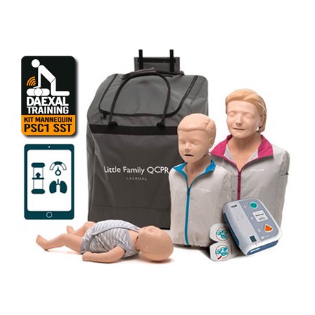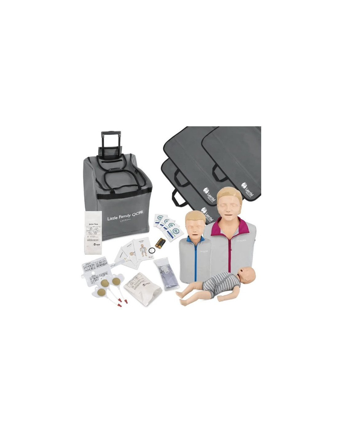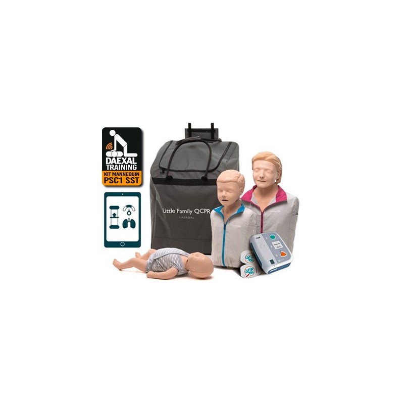 Sac de transport renforcé, piles/batteries, manuels utilisateurs, guide pédagogique QCPR.