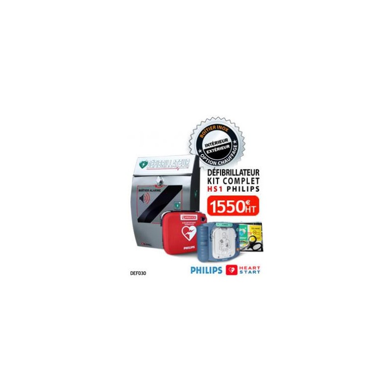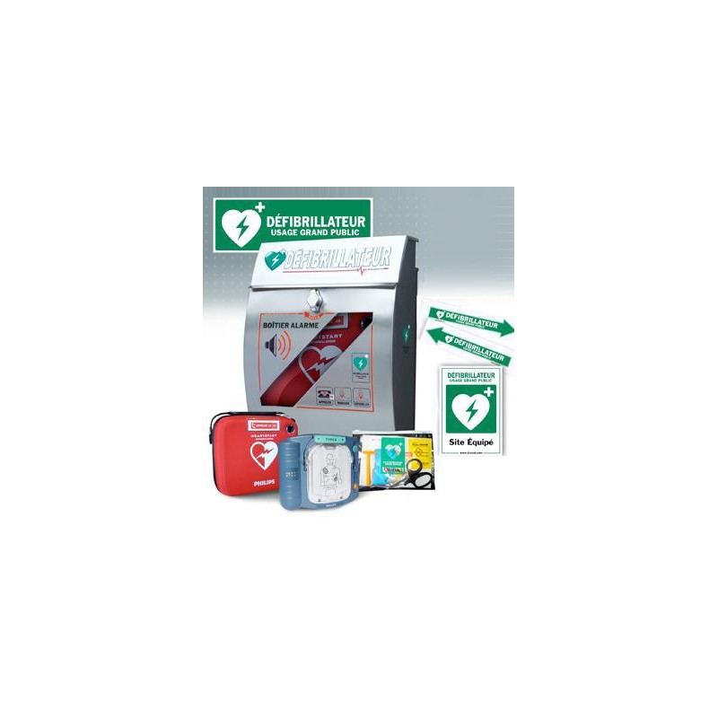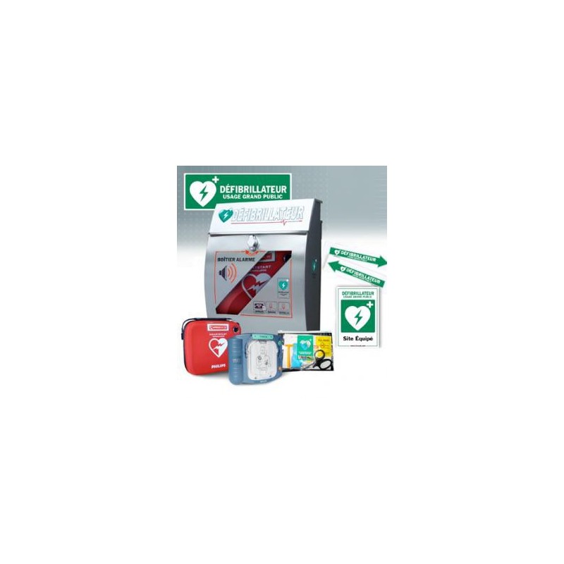 Boitier design 100% Inox, signalétique DAE, kit d'intervention rapide, housse de transport et défibrillateur HS1 Philips
