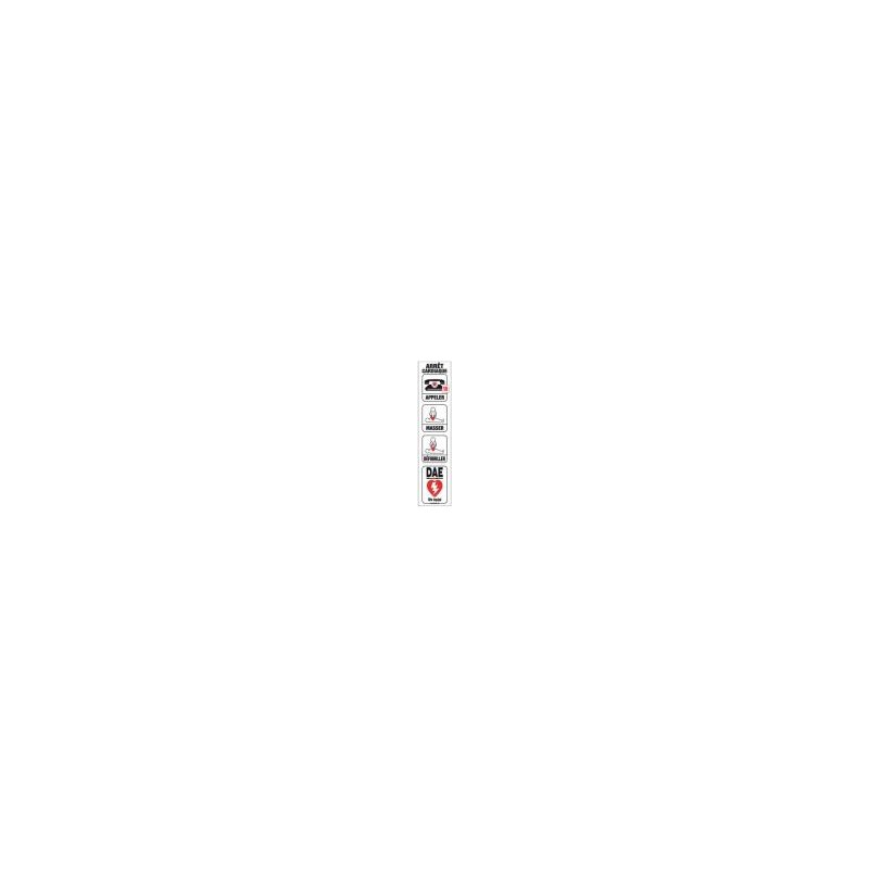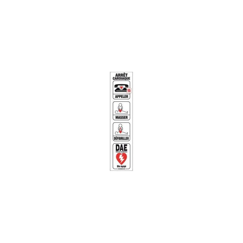 Il rappel les gestes essentiels de la chaîne de survie, et confirme la présence d'un défibrilateur sur le site.
