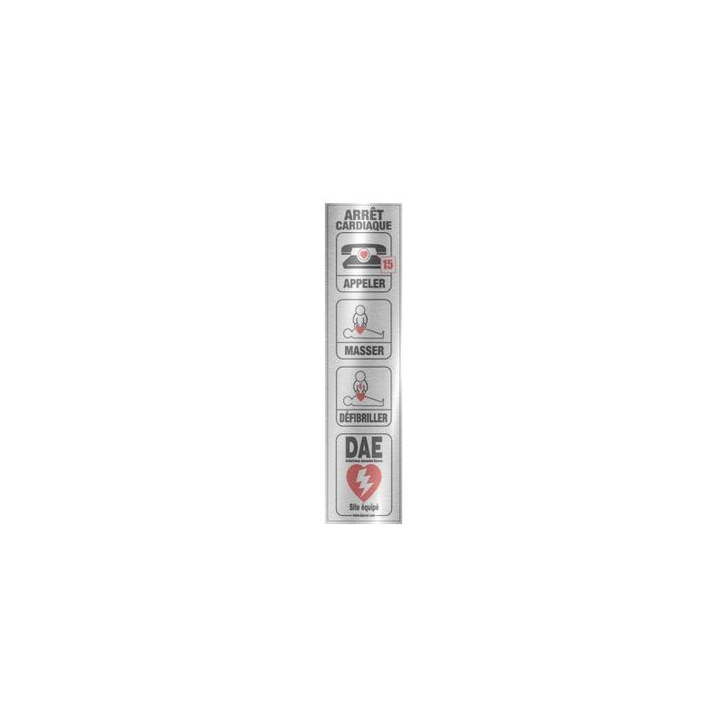Il rappel les gestes essentiels de la chaîne de survie, et confirme la présence d'un défibrilateur dans le site.